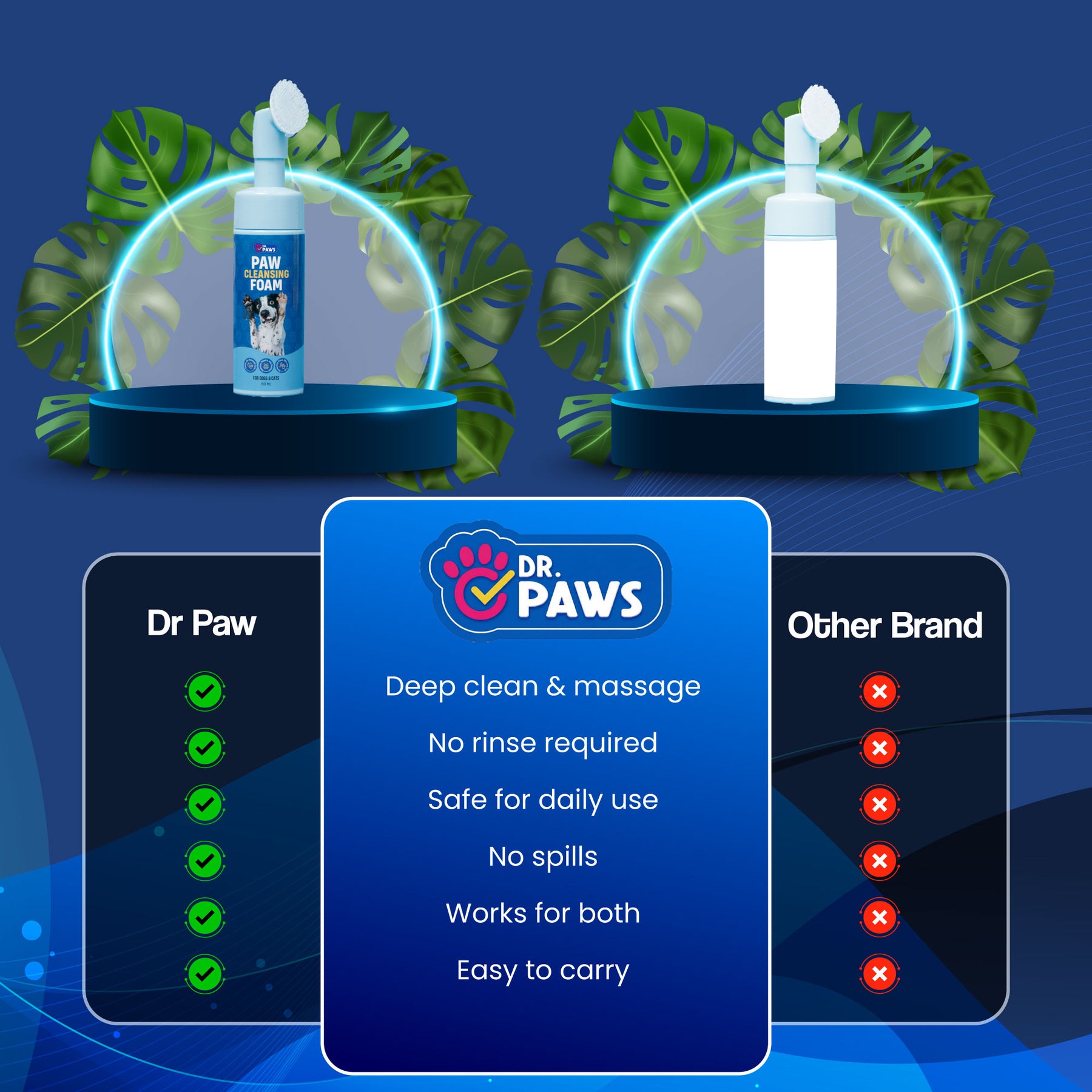 Nuestro limpiador de patas para perros incluye un cabezal de cepillo de silicona suave que elimina suavemente la suciedad y protege la piel y el pelaje de tu mascota. Su fórmula tiene un pH equilibrado (6,5-7,0) para perros y gatos, y es totalmente seguro para lamer, lo que lo hace ideal para uso diario. Sin necesidad de enjuague y con una aplicación sencilla , este limpiador de patas para perros es la solución perfecta para una limpieza rápida después de paseos, visitas al parque o juegos con barro.