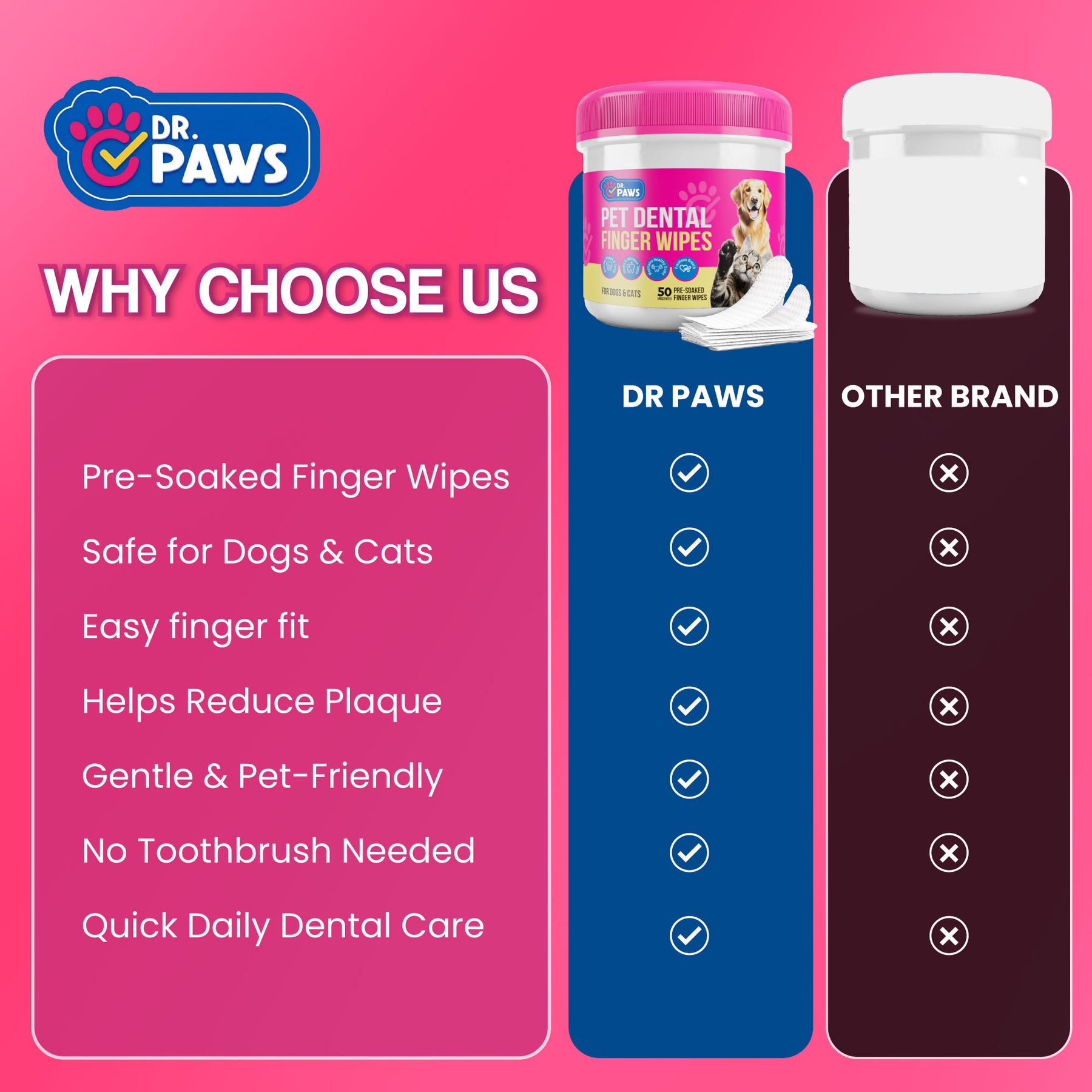 Introducing Dr. Paws Choice Pet Dental Finger Wipes, your ultimate solution for dog bad breath treatment and cleaner teeth for your pets. Our pet dental finger wipes for dogs or cats are designed to promote optimal oral health in your pets, a must-have for every pet owner. They are gentle, soft, and made with natural ingredients that effectively remove plaque, freshen breath, and promote healthy gums.